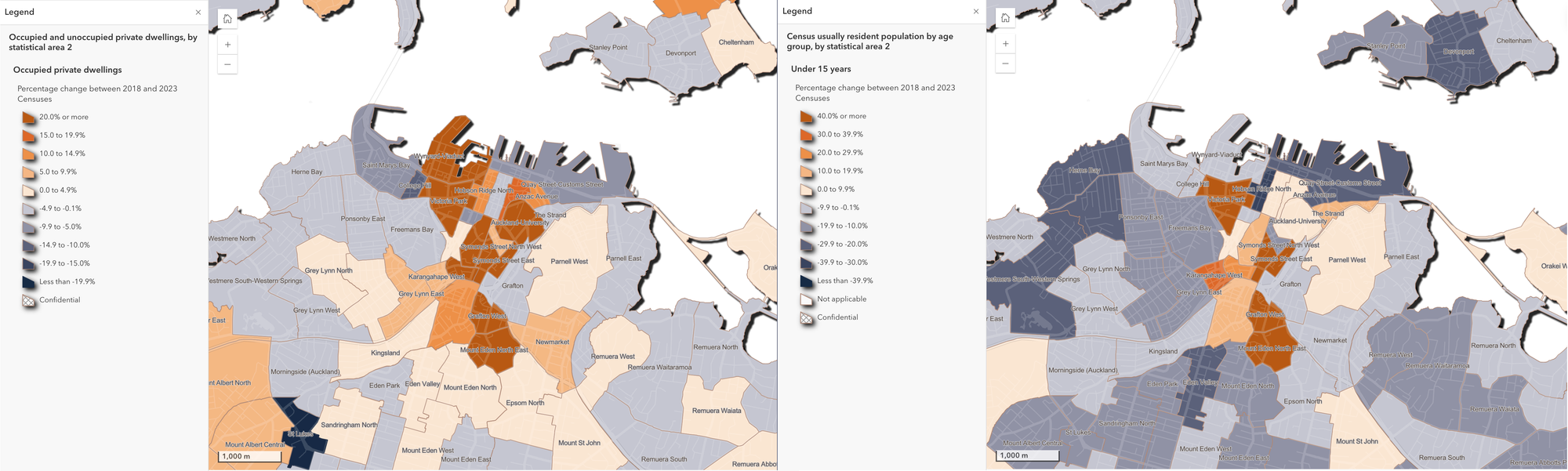 At the complete opposite end of the spectrum we have Devonport, Auckland. A sought after suburb, locked down from redevelopment with strict heritage controls. The number of occupied dwellings is static. The population of children under 15 there has fallen nearly 40% in the 10 years to 2023, with school rolls falling significantly. We can assume that many families bought homes in Devonport towards the end of the last century, only for the kids to move out of home, leaving two adults in retirement today. There's a pattern here.
