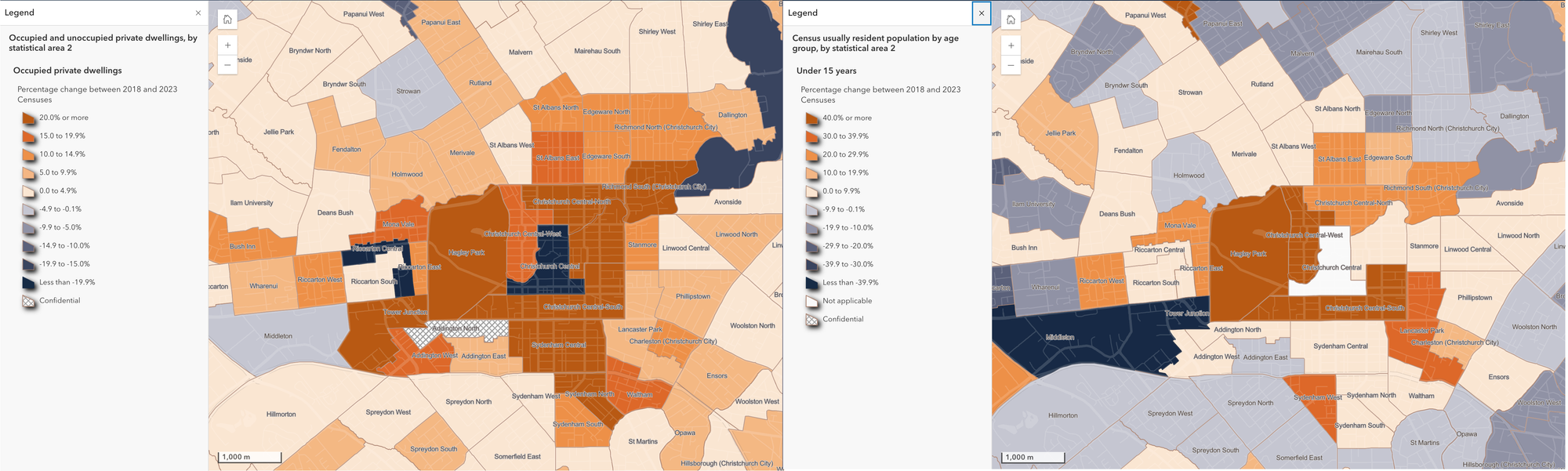 Take an inner suburb of Christchurch, St Albans East, where the number of occupied dwellings, predominantly townhouses, has increased 33% in the 10 years to 2023 (red being higher growth, blue being lower). The number of children in the same area has risen by 45% in 10 years. A similar pattern emerges for many suburbs with housing growth in the area.